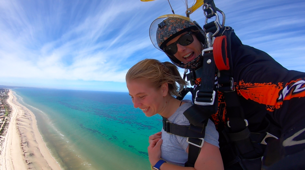Hayden contacted Coastal Skydive with the intention to give his beautiful wife-to-be an experience she could never forget! Family and friends also enjoyed the moment, standing on the beach beside the large “Will you marry me?” banner that we set up on gorgeous Semaphore where Courtney landed after her skydive. The expression on her face when she realised what was happening is priceless!